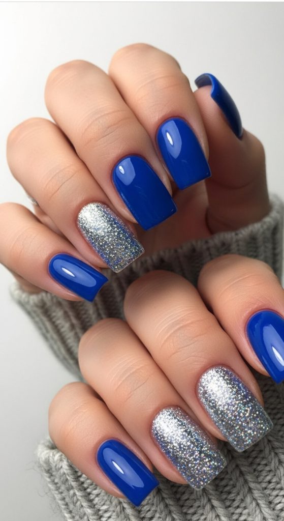 This style combines solid blue nails with one or two glitter accent nails.