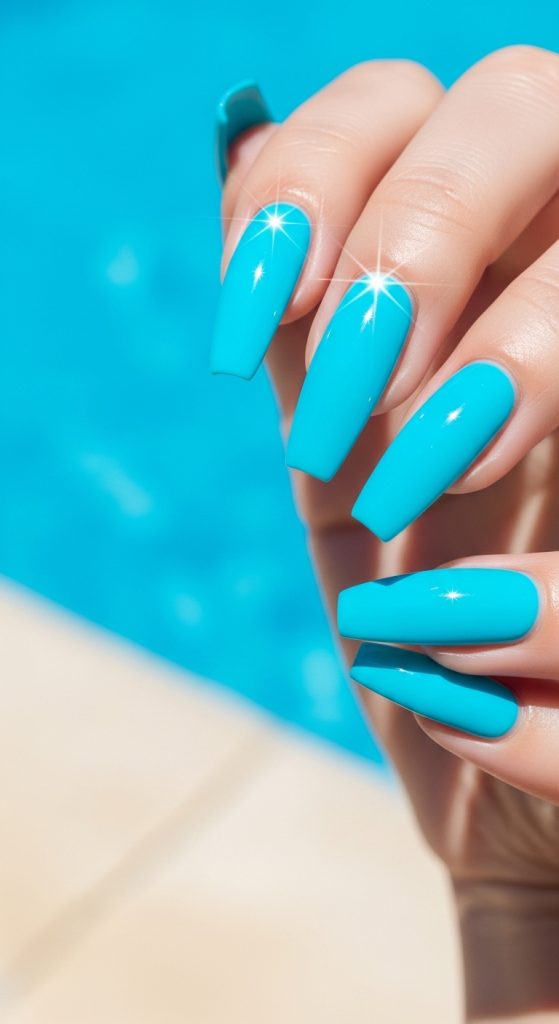 Neon blue nails are bold and vibrant. They’re perfect for vacations, festivals, and beach days.