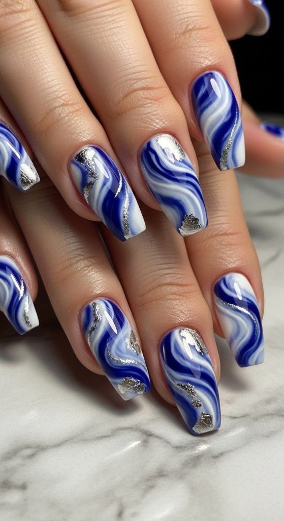 Blue marble nails mimic swirling stone patterns. They look luxurious and artistic.