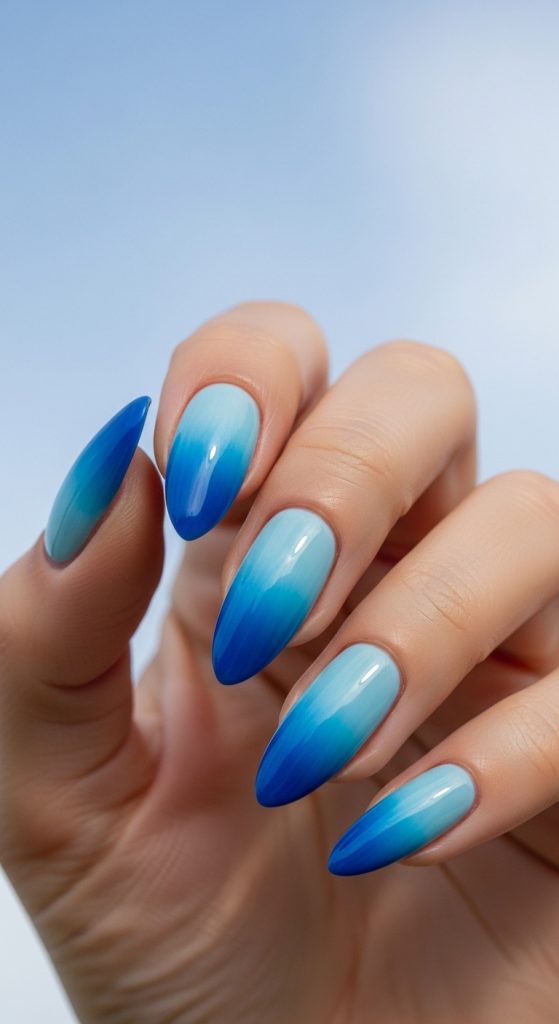 Blue ombré nails blend two or more shades together for a soft gradient effect. Popular combinations include baby blue to white or turquoise to navy.