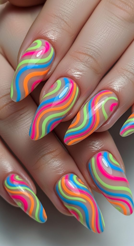 Swirl nails feature curved, flowing lines layered over a base color. Funky versions often use contrasting or neon colors and asymmetrical patterns for added impact.