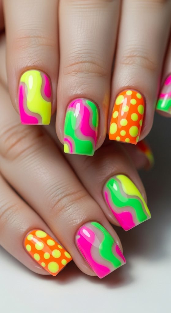 Neon funky nails are bold, energetic, and impossible to ignore. This design is perfect for summer, festivals, or anyone who loves bright, statement-making nails.