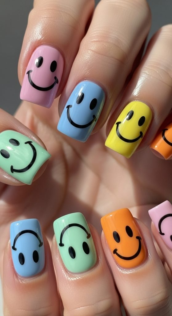 This style features smiley faces painted or applied as decals on one or more nails, often paired with bold or pastel backgrounds.
