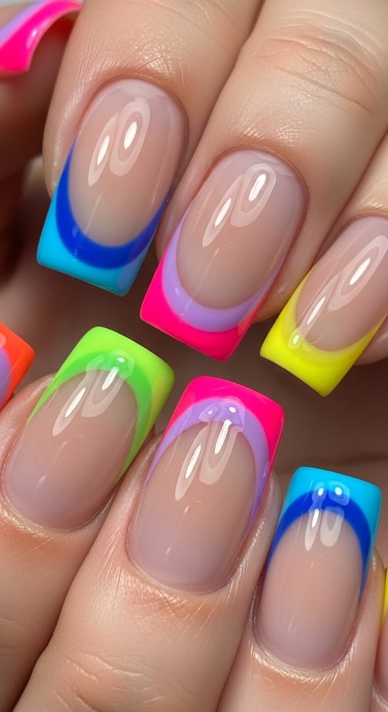Instead of traditional white tips, this style uses bright colors, curved lines, or graphic designs on the tips.