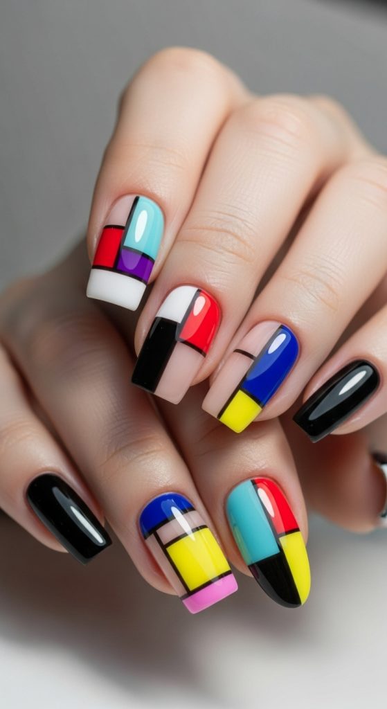 Funky color block nails are bold, modern, and clean. They rely on strong color contrast for impact.