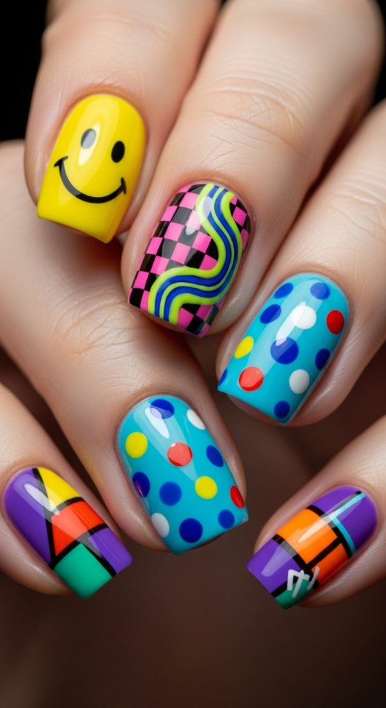 Mismatched funky nails feature a different design on each nail or each hand. Designs can include swirls, dots, smiley faces, checkerboards, abstract shapes, or color blocks. The unifying element is usually a consistent color palette or overall theme.