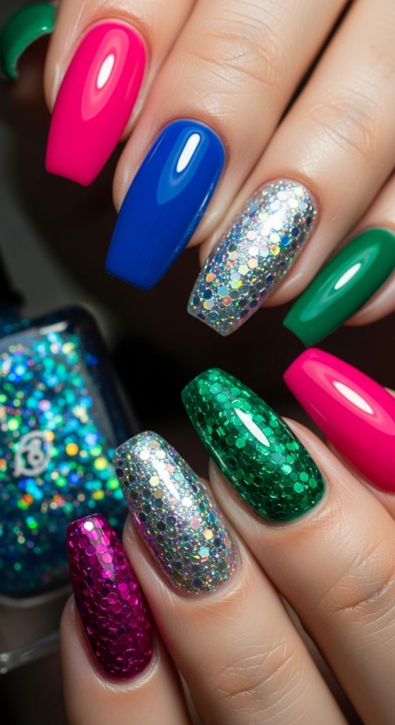 Funky glitter nails add sparkle while maintaining a playful edge. This style balances boldness with glam.
