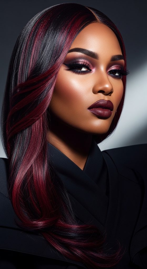 Black and burgundy is a bold yet elegant color combination that adds richness and depth to dark hair. Burgundy tones create a subtle red shimmer that becomes especially visible under sunlight or bright lighting.