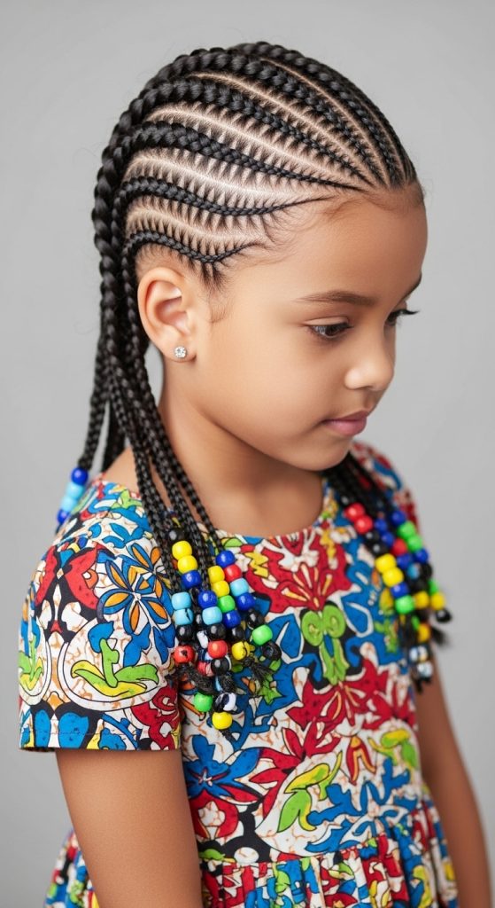 Braided ponytails with beads are a classic and beautiful protective hairstyle for kids. The braids keep the hair neat while beads add fun and personality.