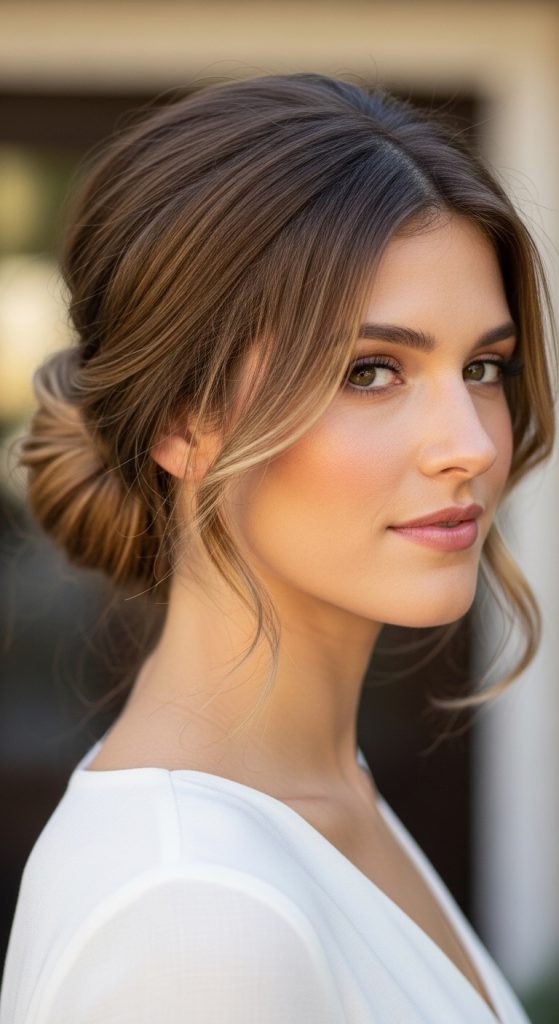 SEO Keywords: side bun hairstyle, easy elegant hair up styles, medium hair updos.