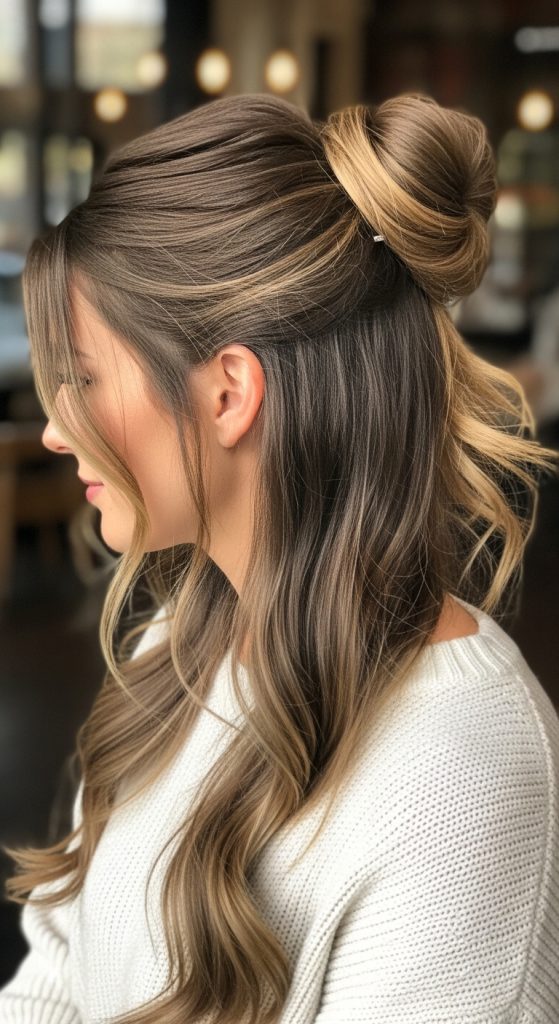 Combine a half-up hairstyle with a bun twist. Pull half of your hair into a bun, leaving the rest down. It’s casual yet chic, perfect for daily wear or casual gatherings.