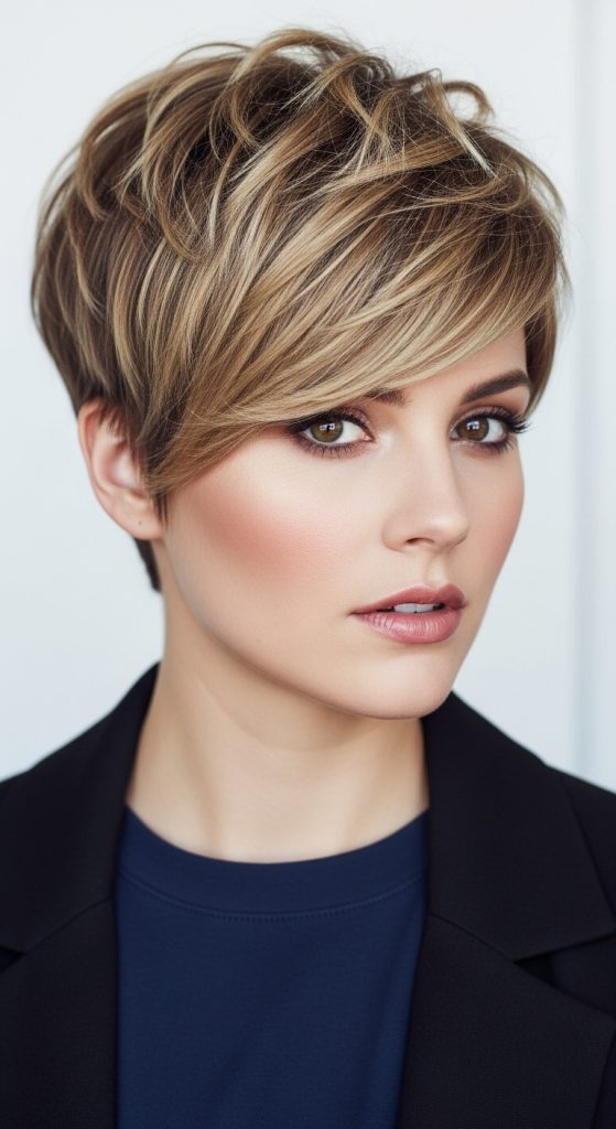 A layered pixie cut with a side fringe is a bold yet flattering choice for round faces. The layers add volume at the top, which helps elongate the face, while the side fringe softens the look.