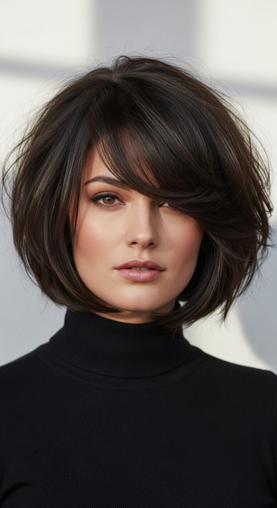 Side bangs add an asymmetrical element that helps slim the face. Instead of emphasizing width, the angled bangs guide attention diagonally across the face. This creates contrast and structure.