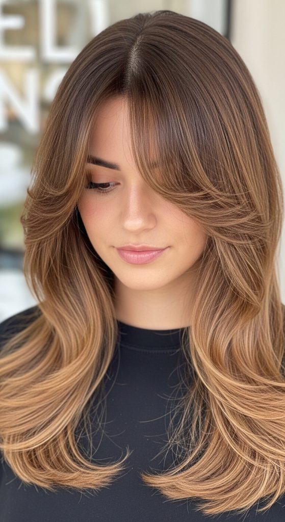 Curtain bangs gently part in the middle and frame both sides of the face, reducing sharp angles around the forehead and cheeks. The long layers add flow and prevent hair from looking flat.