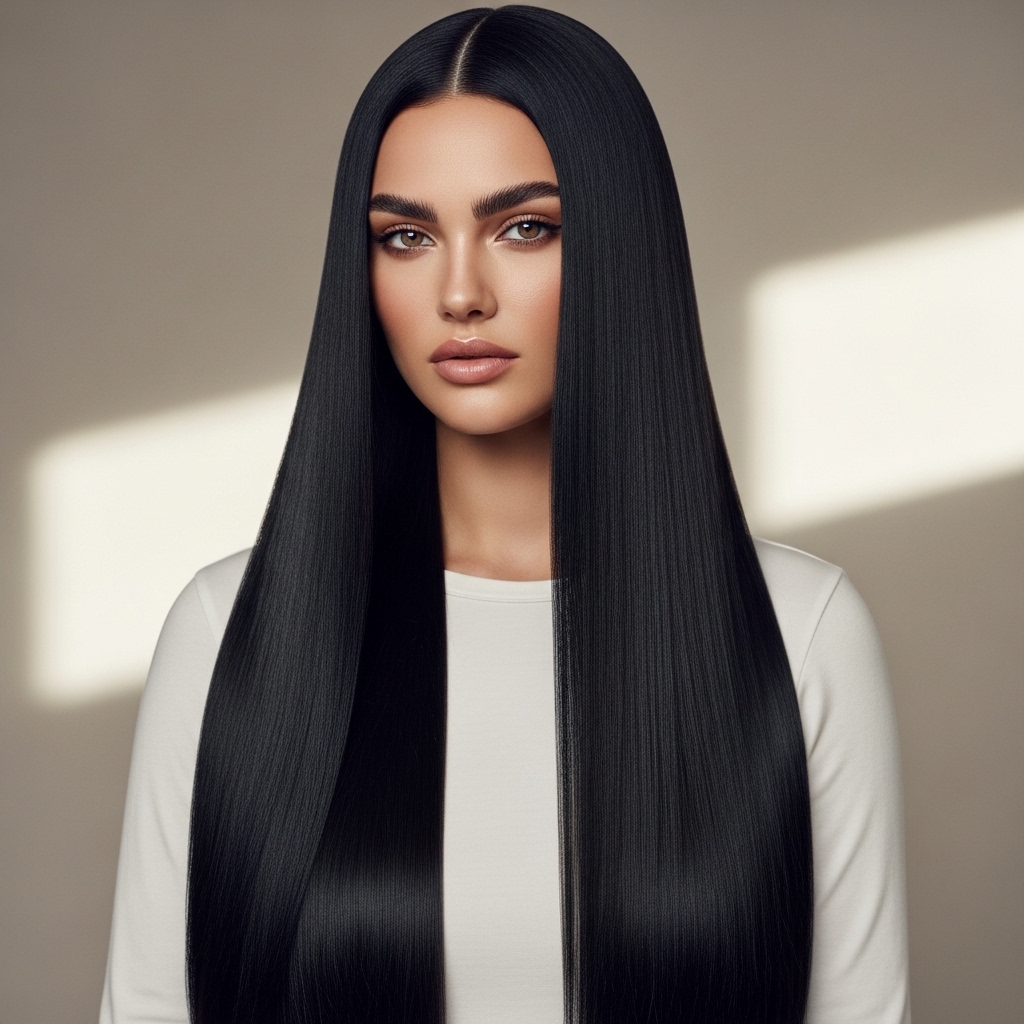 The sleek middle-part “glass hair” look is the definition of modern elegance. This style focuses on ultra-smooth, mirror-like shine with perfectly straight strands and a clean center part. It works beautifully for formal events, office settings, or minimalist fashion aesthetics.