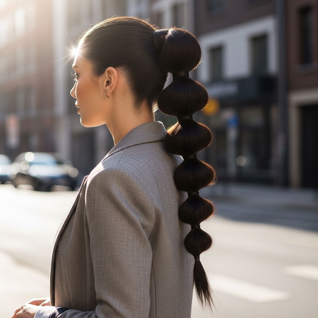 The bubble ponytail transforms simple straight hair into something playful and eye-catching.