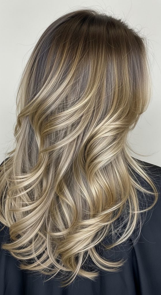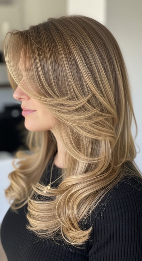 This style keeps the outer layer of hair straight while the underneath layers are softly waved. It creates hidden texture that reveals movement when the hair flows.
