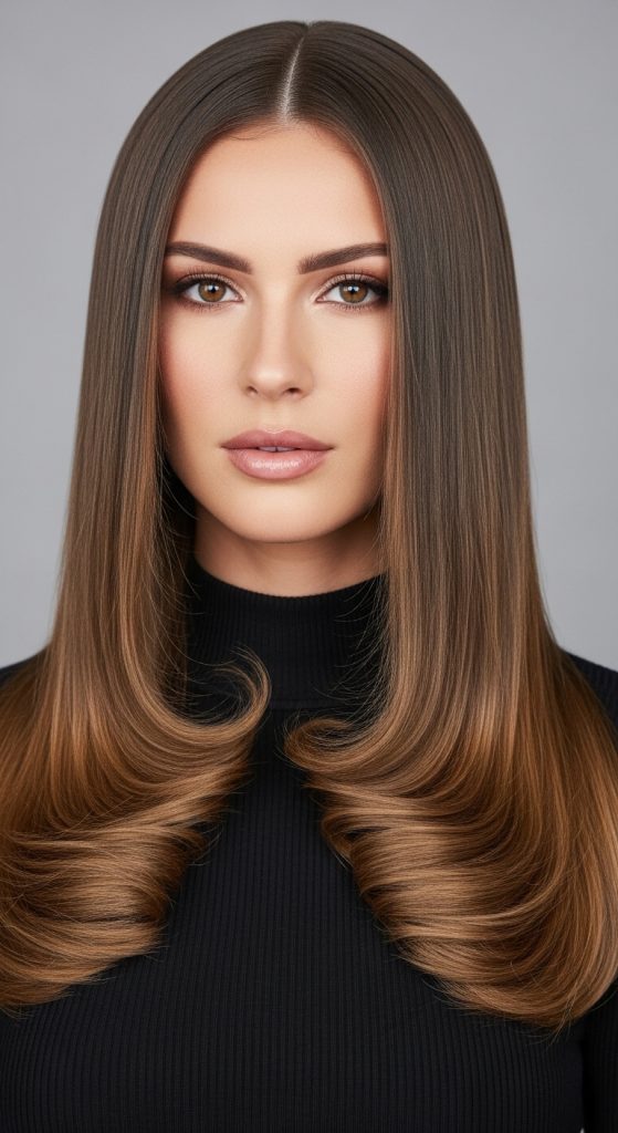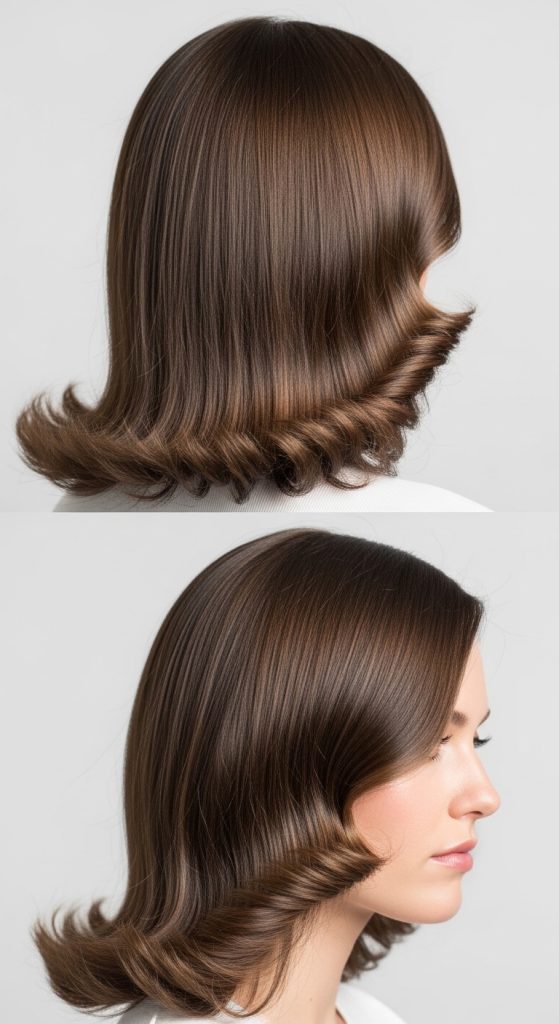 This hairstyle keeps the top and mid-lengths sleek and straight while adding soft curls only at the ends. The contrast feels elegant and controlled, making it ideal for everyday wear or formal occasions.
