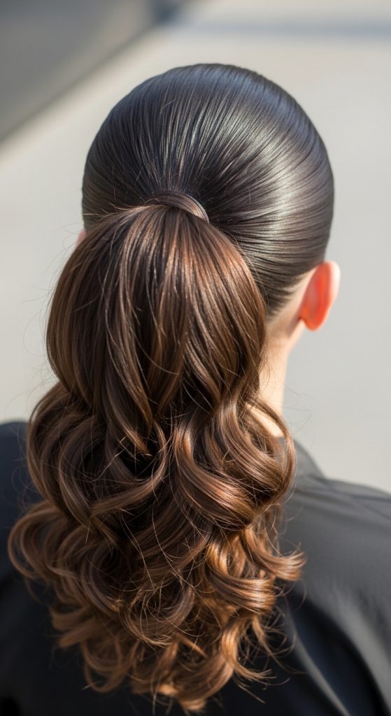 This hairstyle combines a sleek straight crown with a ponytail that transitions into curls. Itโs sporty, stylish, and perfect for events or casual days.