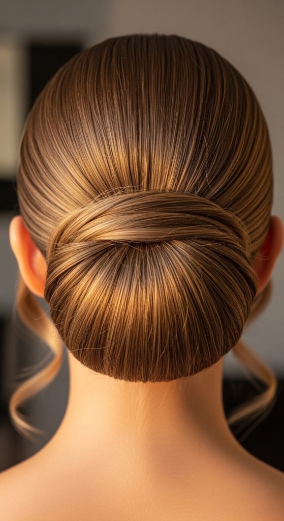 - Straighten hair and pull into low bun.