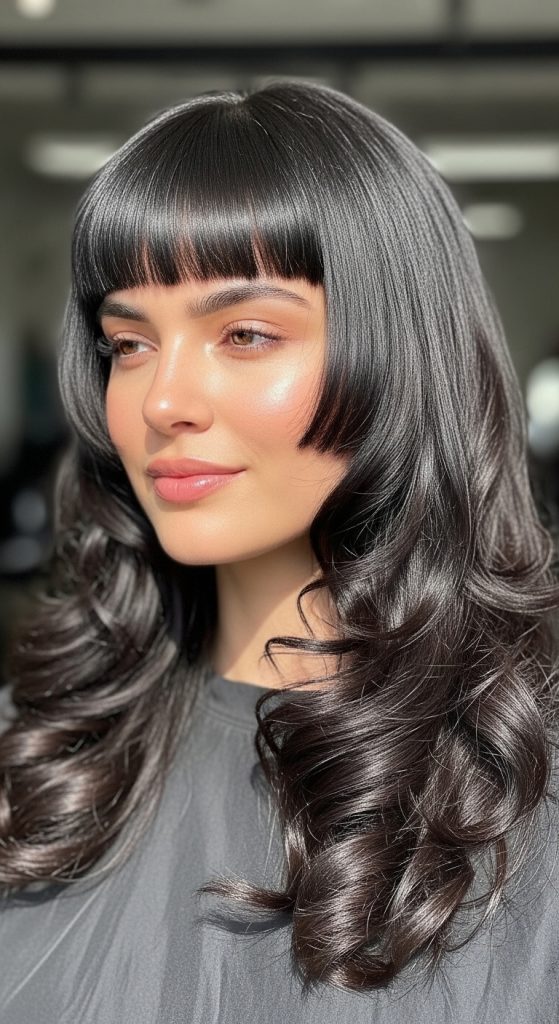 Straight bangs paired with curly lengths create a striking contrast that frames the face beautifully. This style feels modern and fashion-forward.