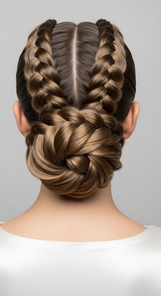 The double braid low bun includes two braids on each side of the head that merge into a single bun at the back. This style creates a balanced and structured look.