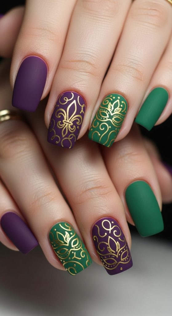 8. Matte Mardi Gras Nails with Gold Details