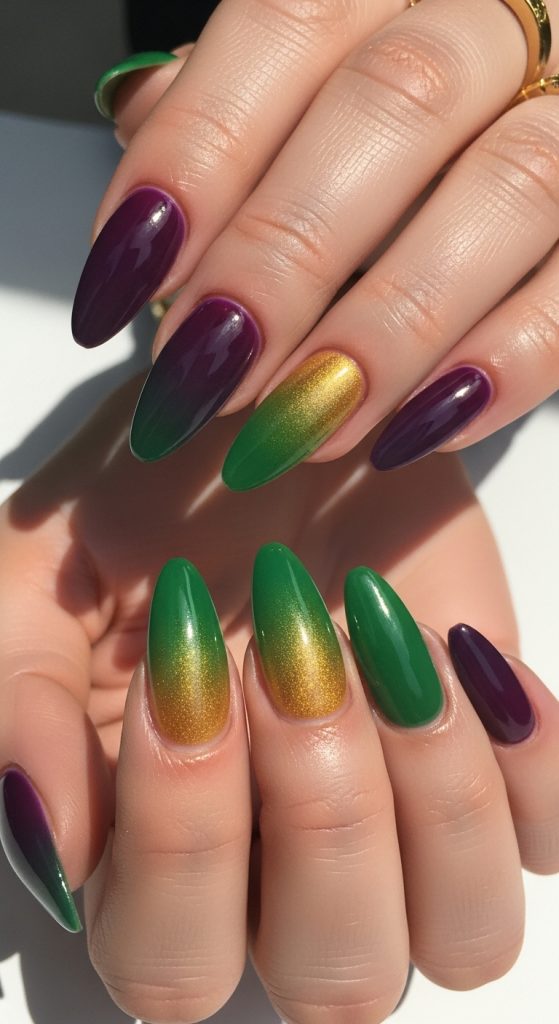 Ombre nails blend Mardi Gras colors seamlessly for a soft yet festive look. This style is elegant and wearable beyond the celebration.