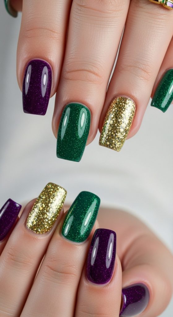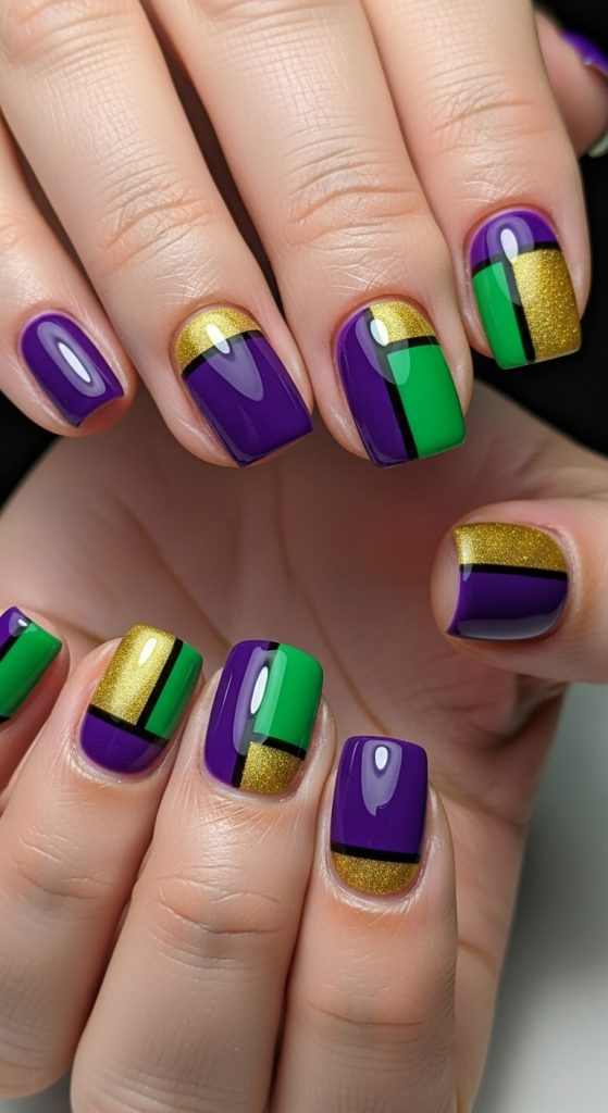 1. Classic Purple, Green, and Gold Color Block Nails