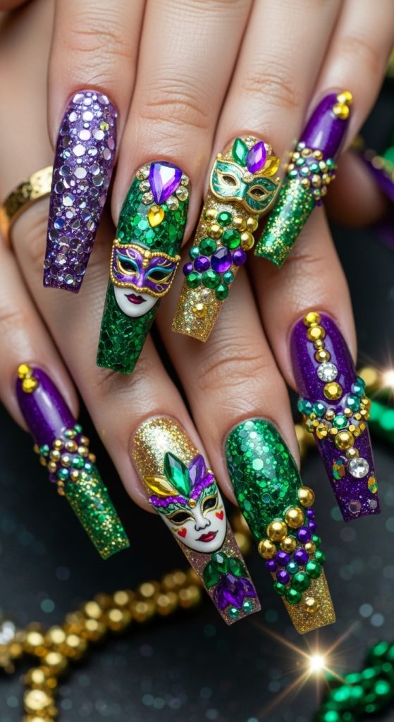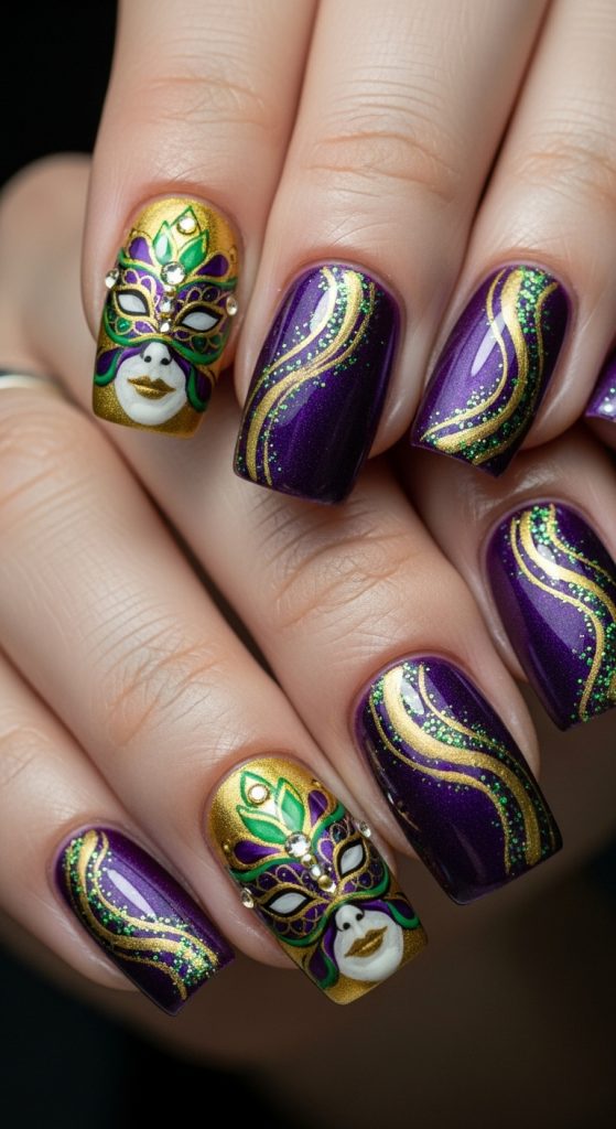 Mask designs are iconic for Mardi Gras. This nail idea incorporates hand-painted or decal masks as focal points, often paired with rich background colors and metallic details.