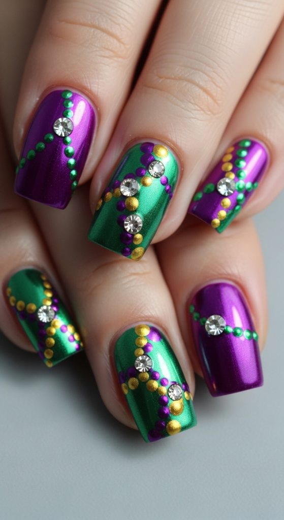 This design mimics Mardi Gras bead necklaces using dots, lines, and rhinestones. It creates a textured, playful look that feels true to carnival culture.