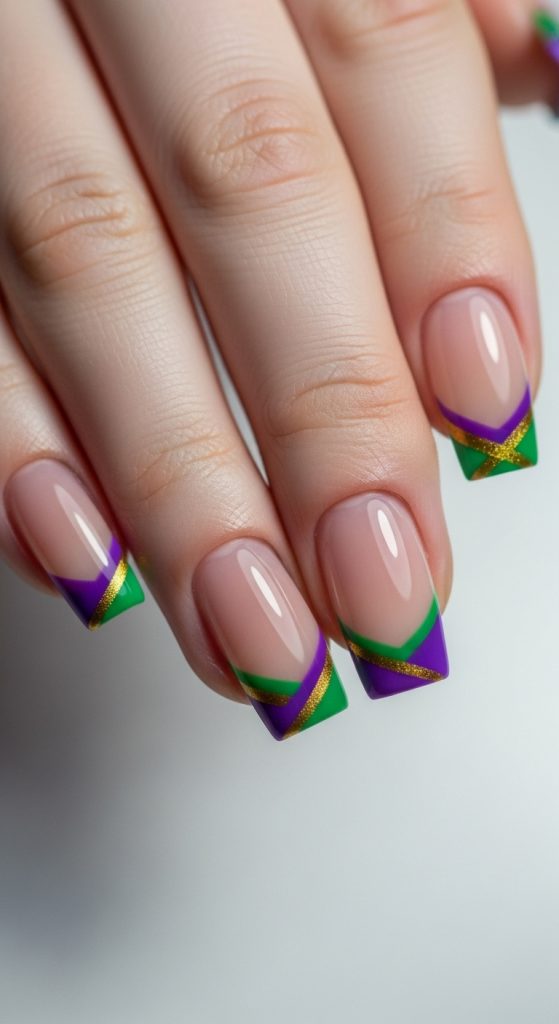 This design reinvents the French tip using Mardi Gras colors instead of white. It’s subtle yet festive.