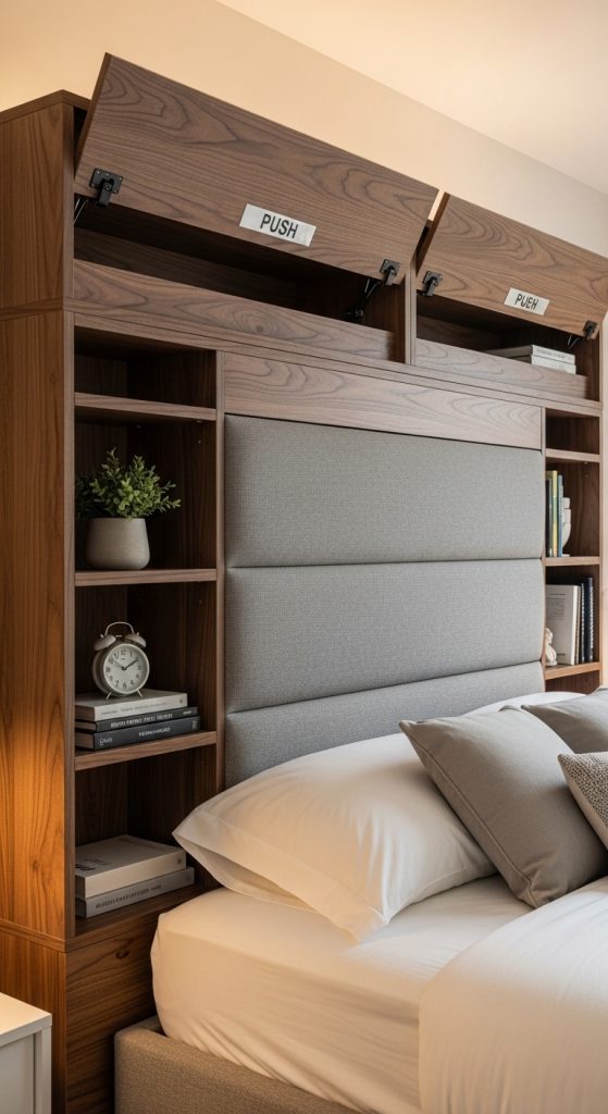 A storage headboard combines style and functionality. It includes shelves, cabinets, or hidden compartments for books, décor, or personal items. Ideal for keeping the bedroom organized without compromising aesthetics.