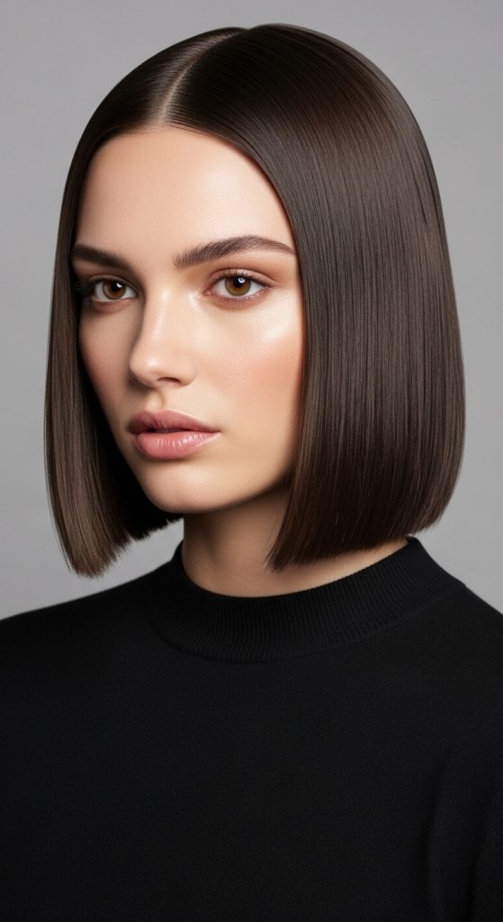 Keep the length at shoulder level and ask for no layers. Blow-dry straight and use a flat iron for a sleek finish.