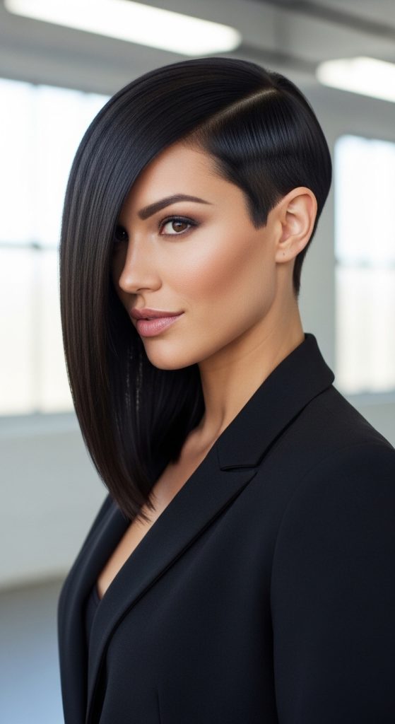 An asymmetrical cut adds visual interest and makes thin hair appear thicker. One side is slightly longer, creating a modern look.