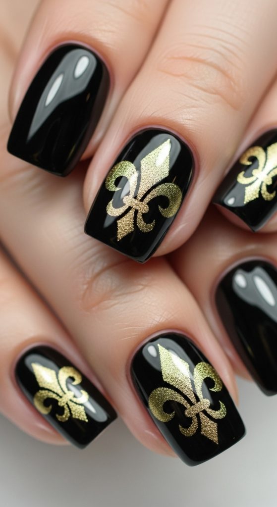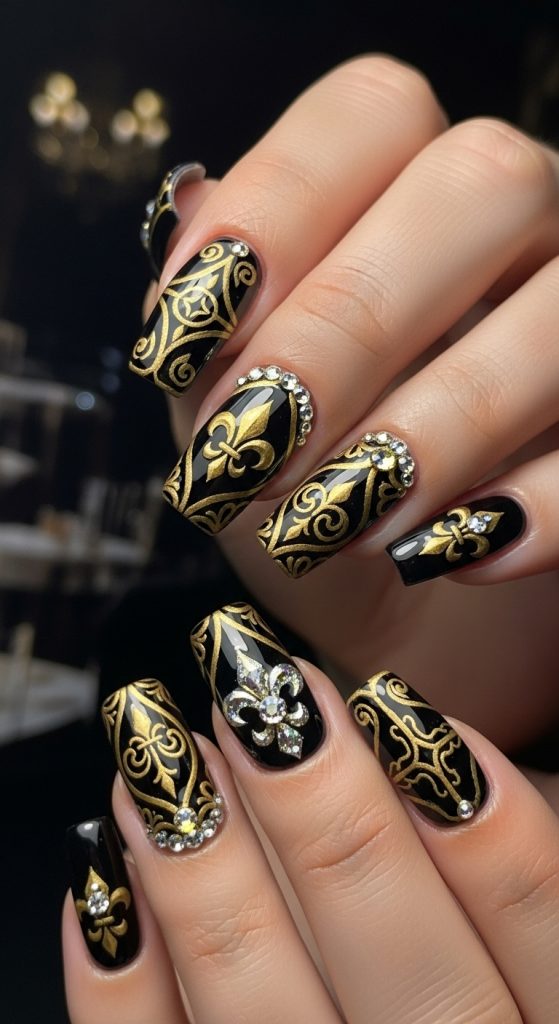 This luxurious design combines black polish, gold accents, and rhinestones for a dramatic, upscale New Orleans look. Perfect for evening events.