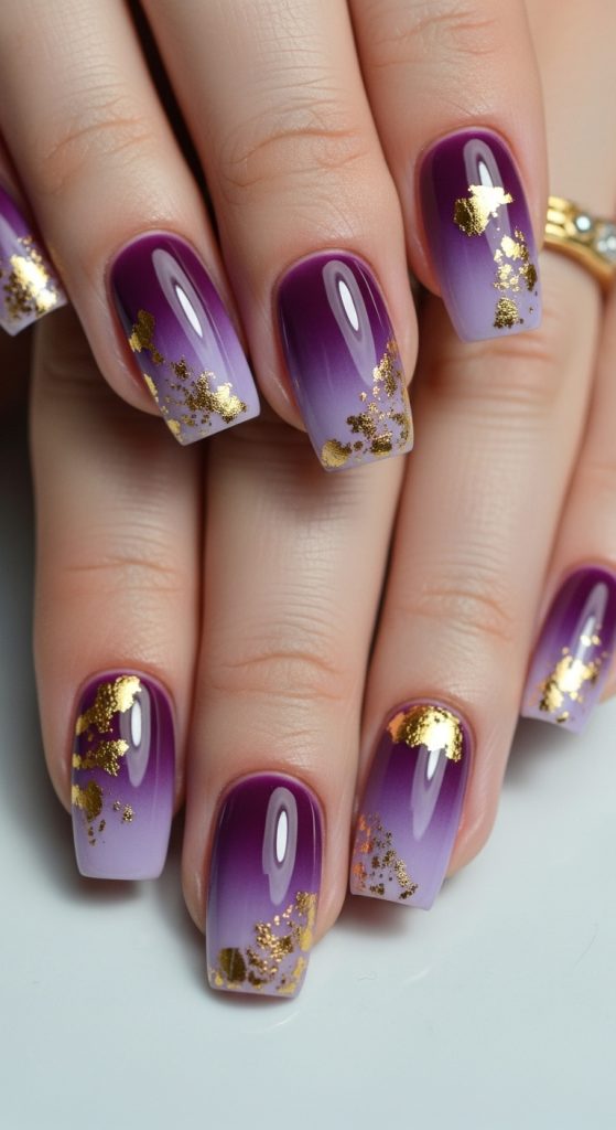 Create a purple ombre using a sponge technique. Once dry, add gold foil or thin gold lines to accent nails. Seal gently.
