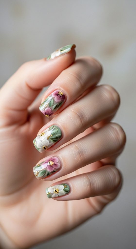 Paint nails in a soft neutral or pastel base. Add floral designs using a fine brush or decals. Finish with a glossy top coat.