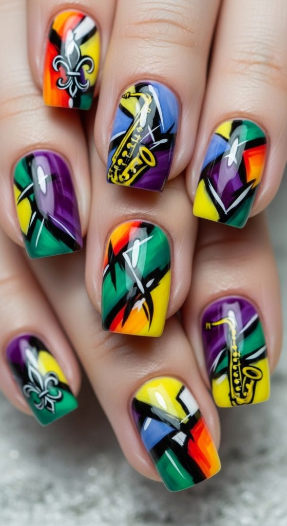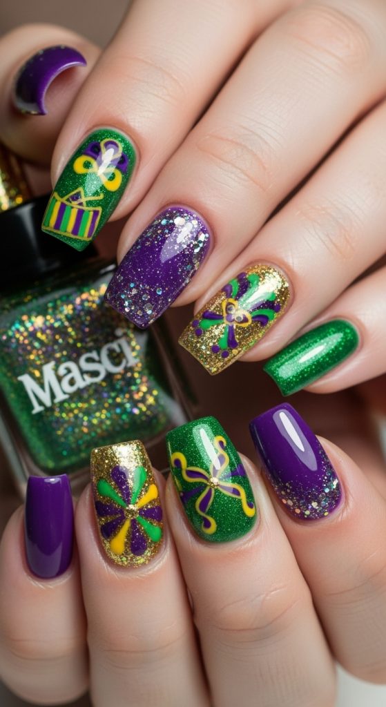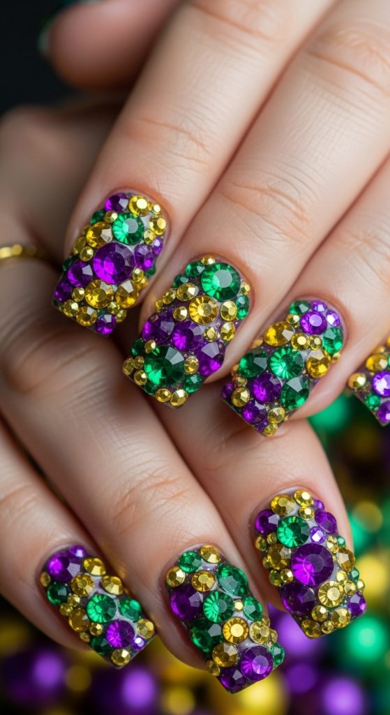 Inspired by the energy of Mardi Gras parades, this design incorporates bold purple, green, and gold along with glitter or bead-like details. It’s playful, festive, and perfect for statement nails.