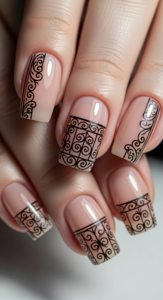 Apply a nude base coat. Use a thin brush to draw curved and looping black lines inspired by balcony railings. Seal with a glossy top coat.