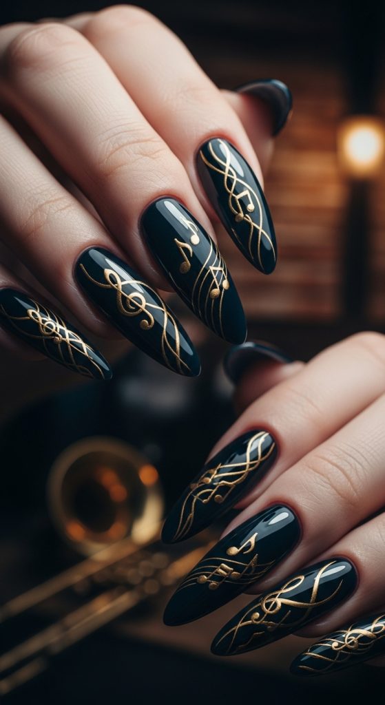 This design draws inspiration from jazz music and nightlife. Think dark bases like black or navy paired with gold musical notes, instruments, or abstract rhythm-inspired lines.