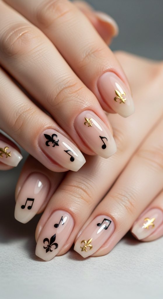Apply a nude or sheer base. Add one small symbol per nail or accent nail only. Seal with a glossy top coat.