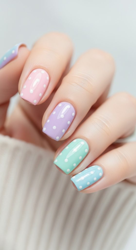 Pastel nail designs use light, muted shades like baby pink, lavender, mint, or sky blue paired with coordinating or white dots.