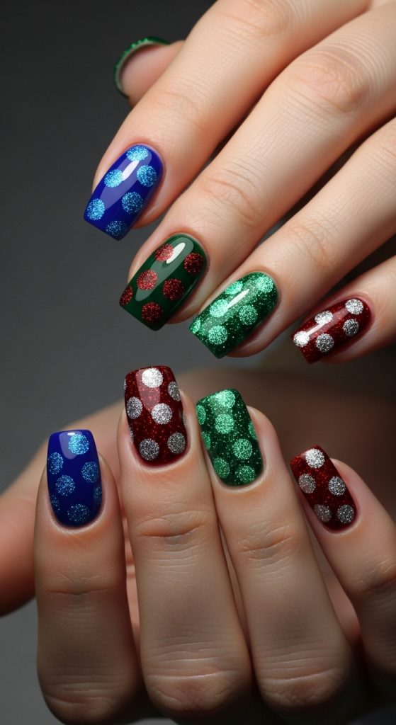 Glitter poka dots nails add sparkle and glamour while maintaining a structured design. This style is perfect for parties and celebrations.