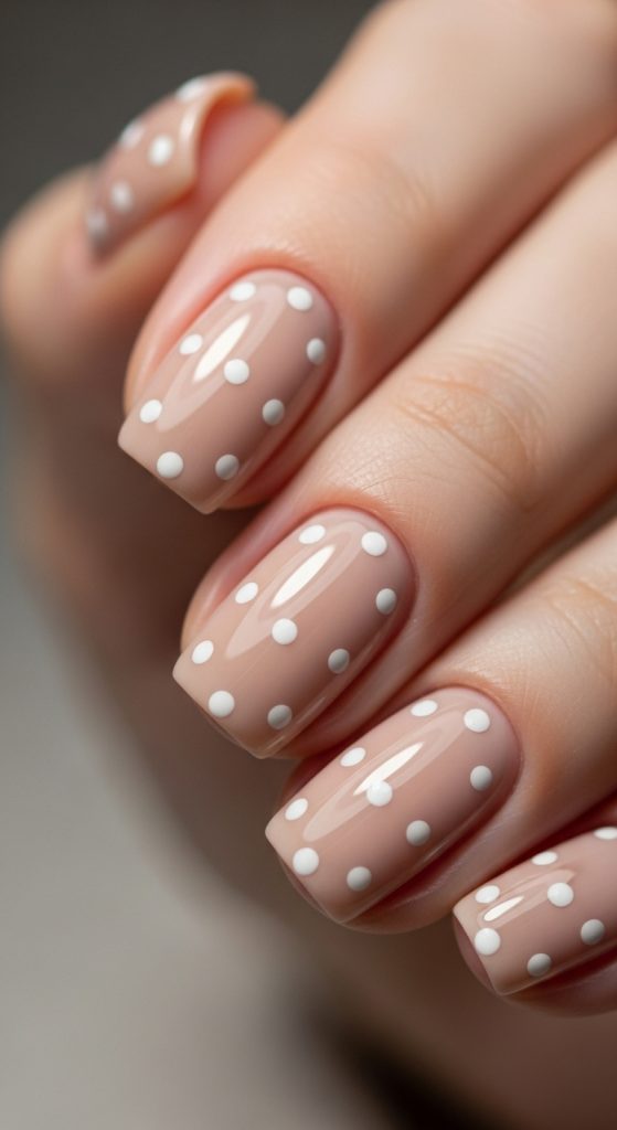 This design features a nude or neutral base color topped with evenly spaced white dots. The simplicity of the color palette allows the dot pattern to stand out without overwhelming the nails. The look is subtle, feminine, and universally flattering.