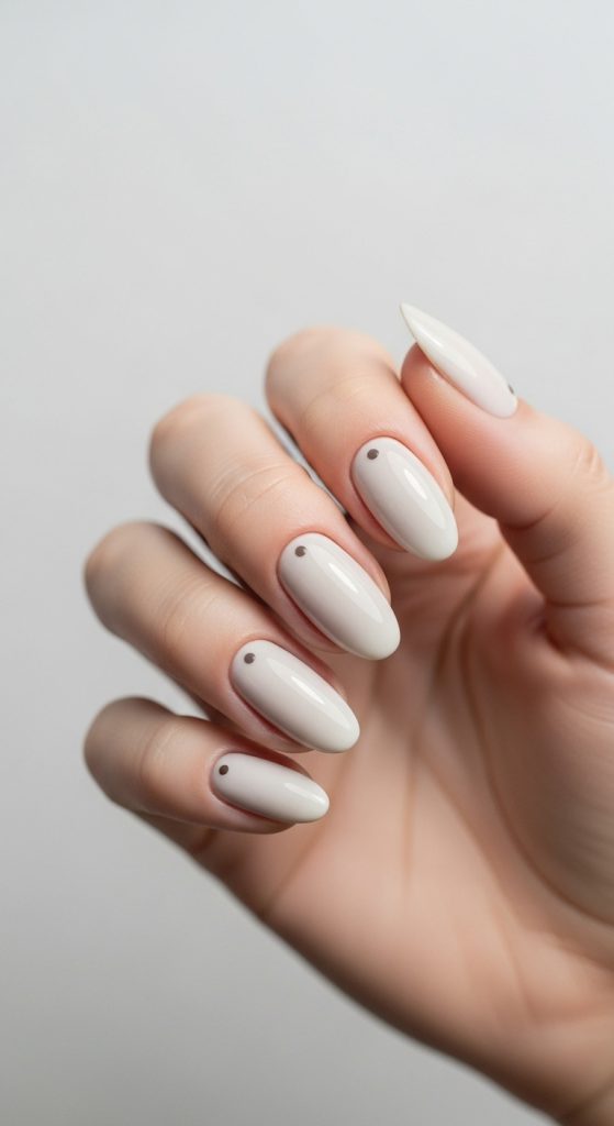 Each nail features a single dot placed strategically near the cuticle, center, or tip of the nail, creating a sleek and intentional look.