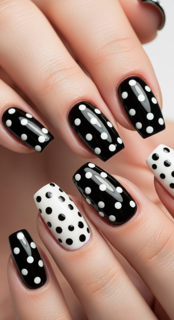 Black and white poka dots nails offer a bold, high-contrast look that feels both retro and modern. This design is perfect for those who want a statement manicure without using bright colors.