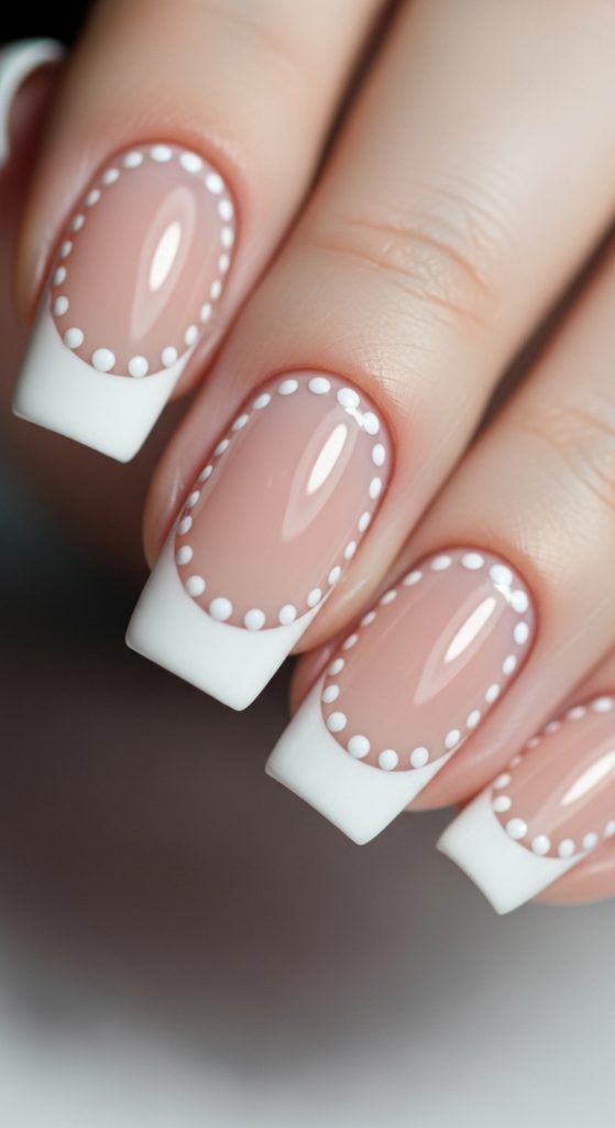Instead of plain white tips, this design adds poka dots either along the tip line or across the entire nail while maintaining a French-inspired base.