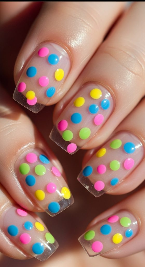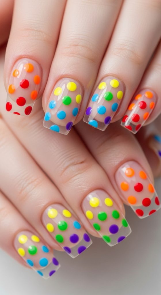 This design uses a transparent or clear base with multi-colored dots placed across the nail. The clear base keeps the look airy while allowing the colors to pop.