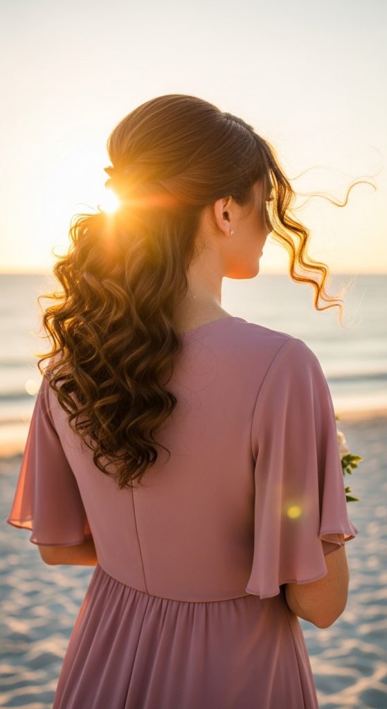 A low romantic curled ponytail is the ultimate soft, elegant bridesmaid hairstyle. Positioned at the nape of the neck, this style feels timeless and refined while maintaining a relaxed, romantic charm. It pairs beautifully with off-the-shoulder dresses, lace gowns, and garden wedding themes.
